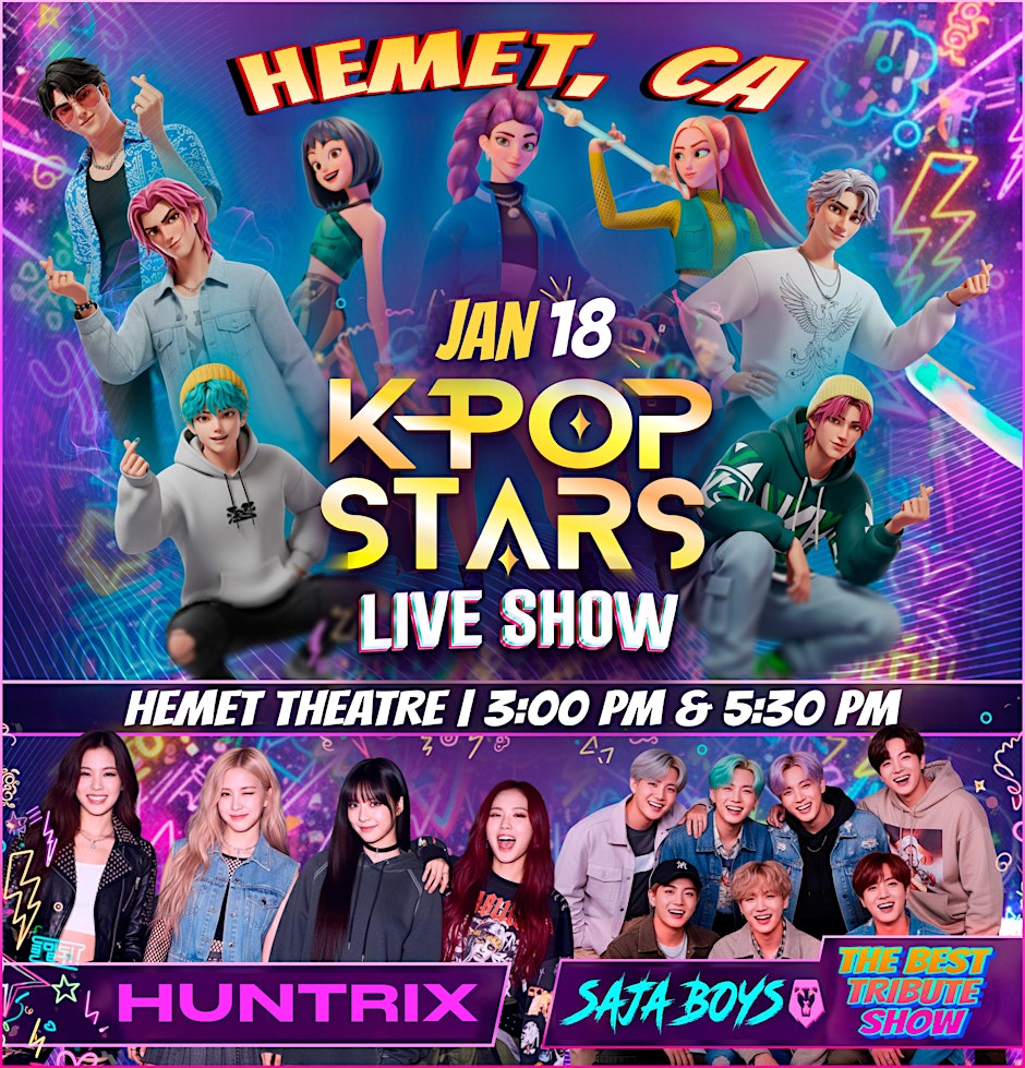 K-POP STARS LIVE SHOW is here to light up the stage with spectacular tributes to your favorite groups: Huntrix Saja Boys BLACKPINK BTS Feel the thrill of electrifying choreographies, stunning outfits, and all the energy that makes K-Pop shine — live on stage! Sing, dance, and vibe to the hits you love as if you were at a real concert in Korea!